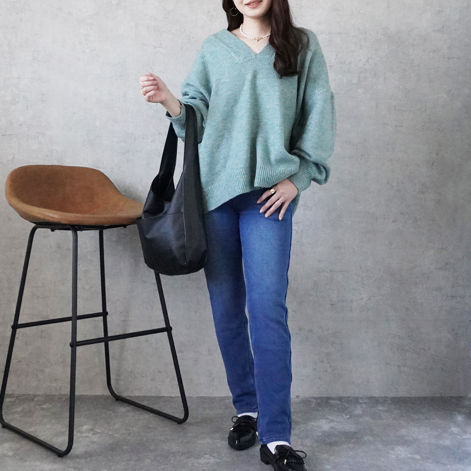 裏側にふんわりシャギー素材を使用した、秋冬にぴったりのニットデニムスキニーパンツ。