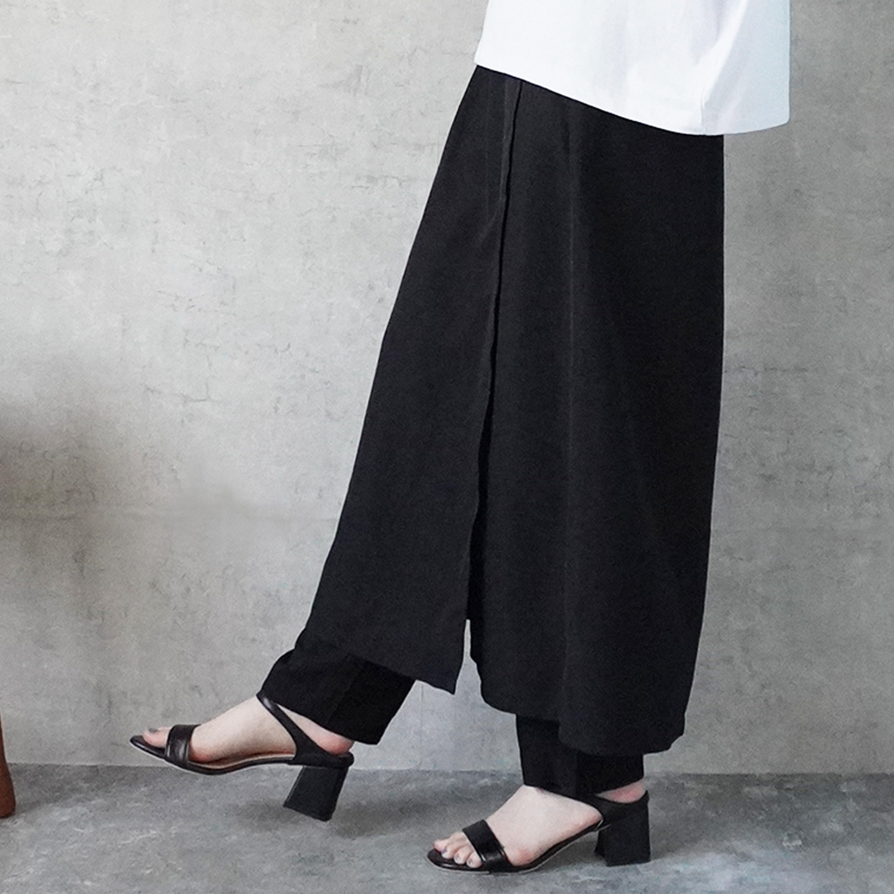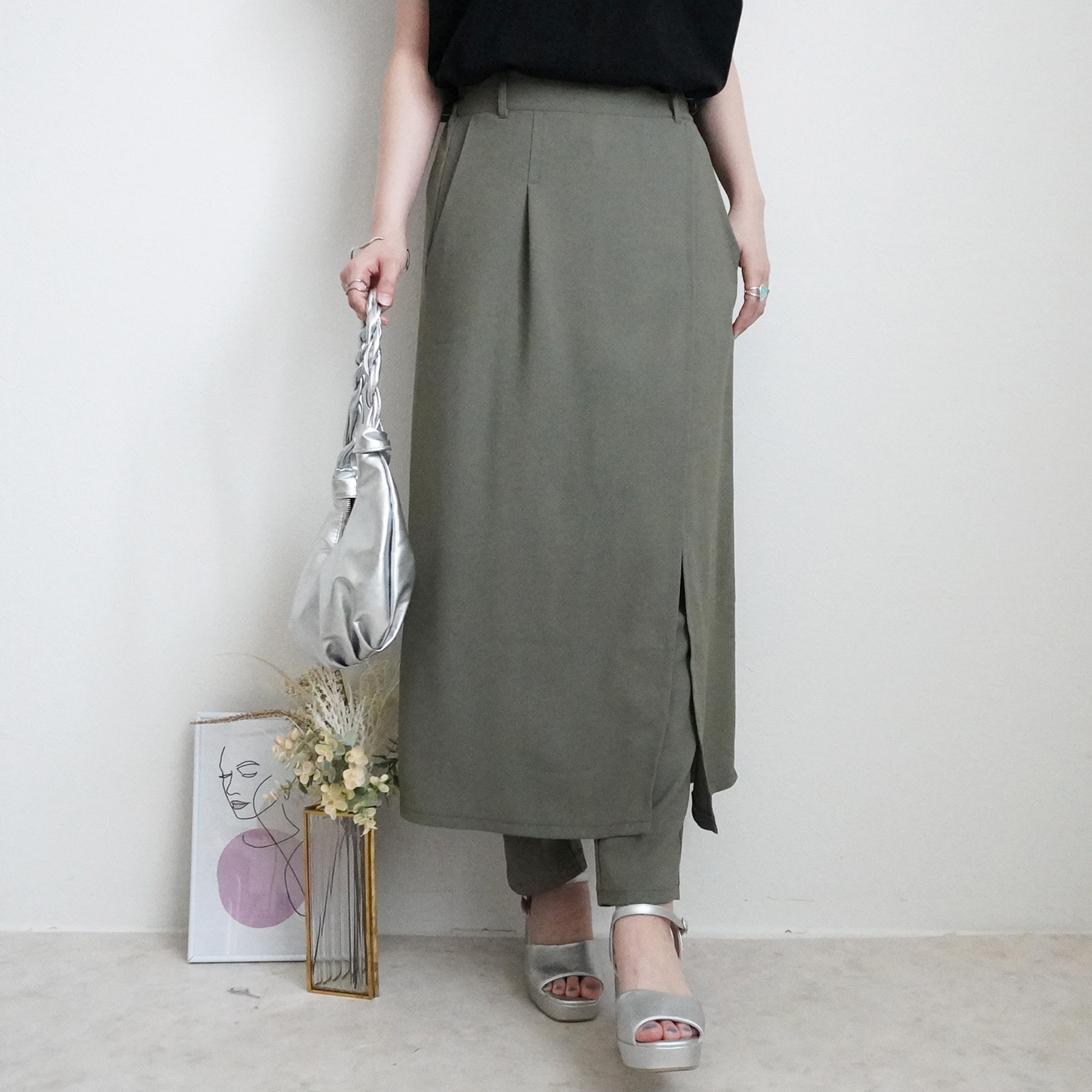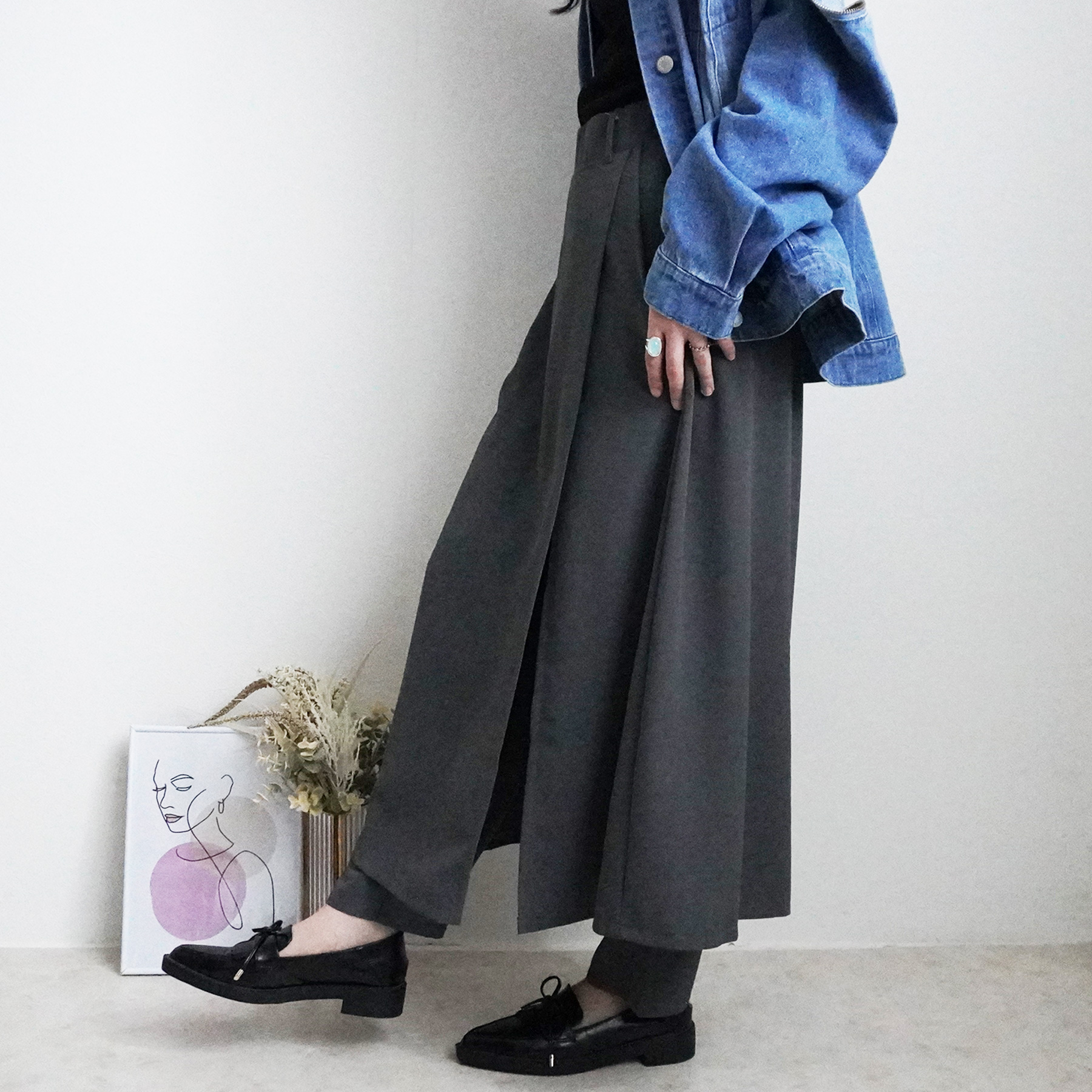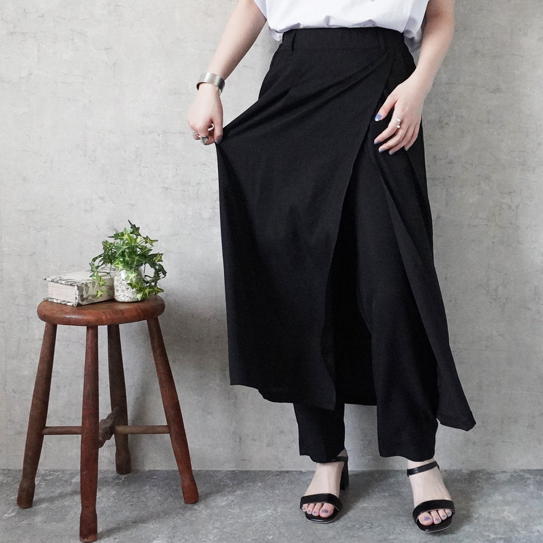 トレンド感と大人の品を両立した、スカートレイヤードデザインのパンツ