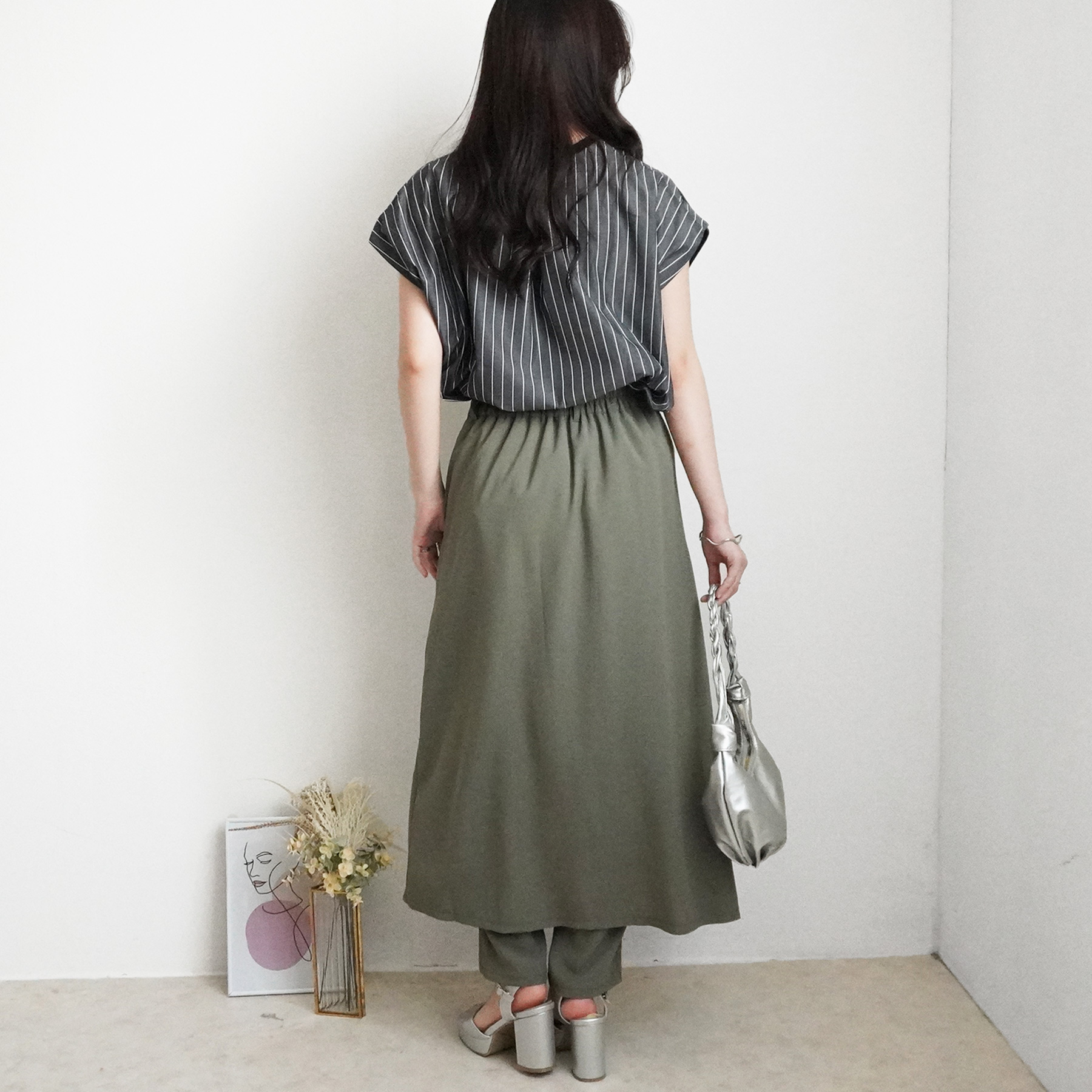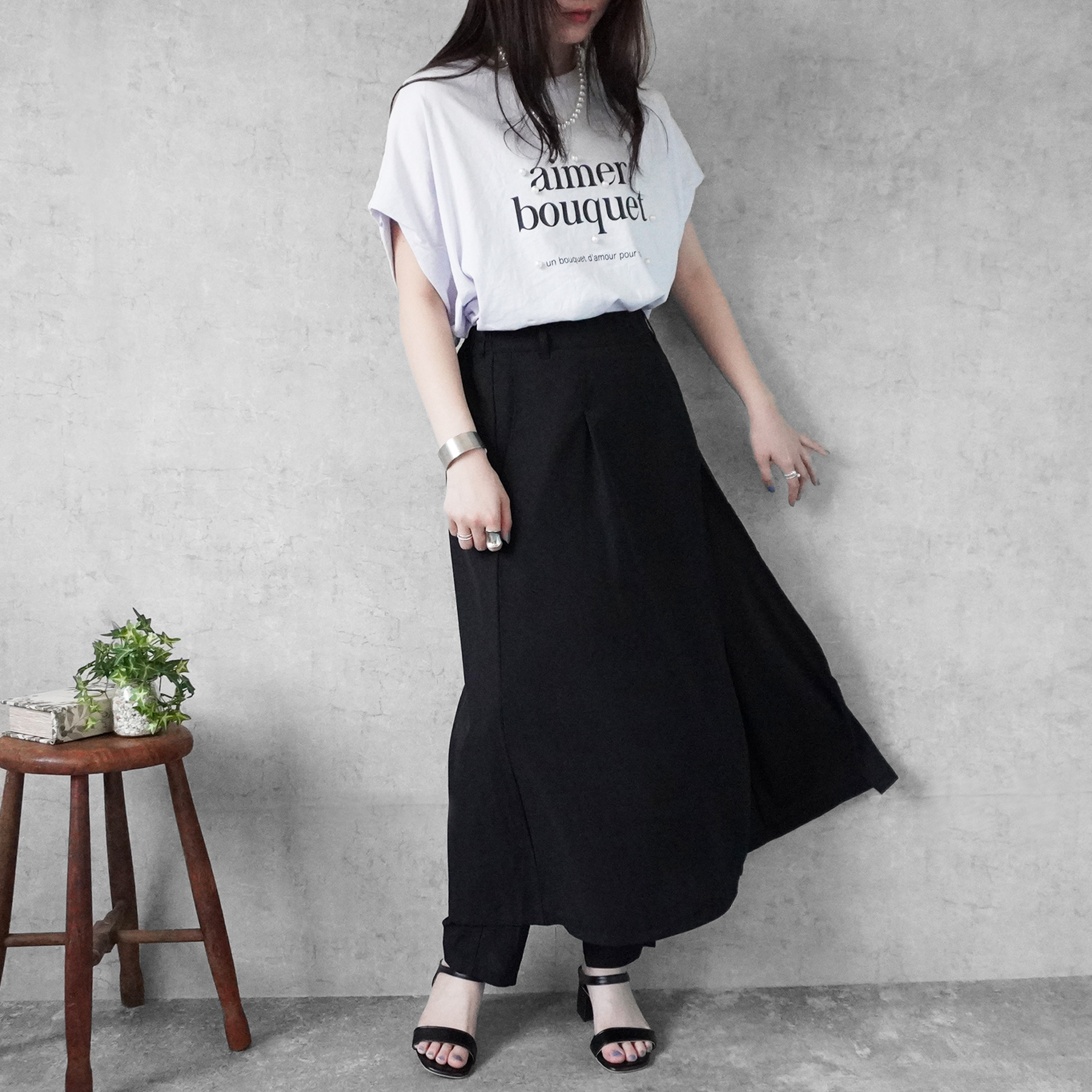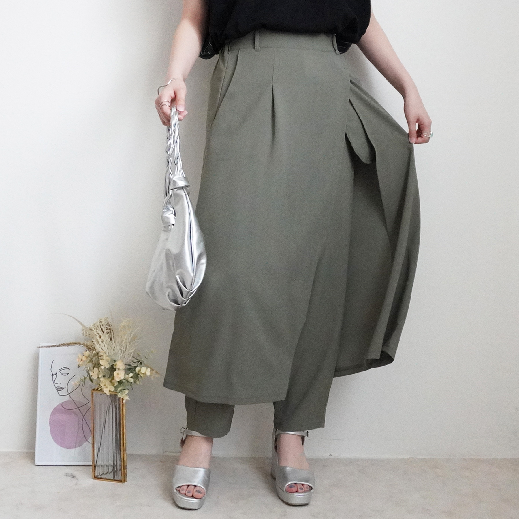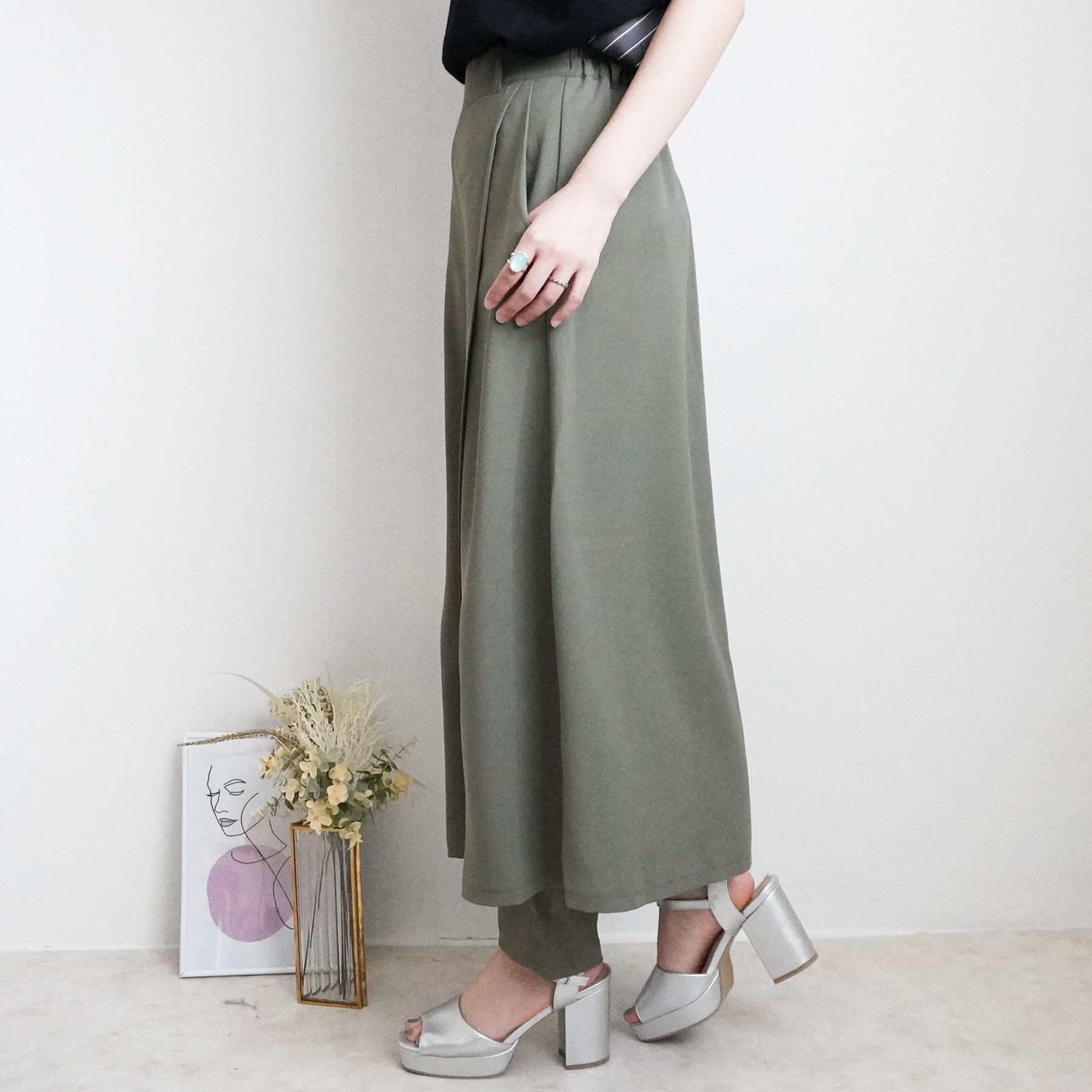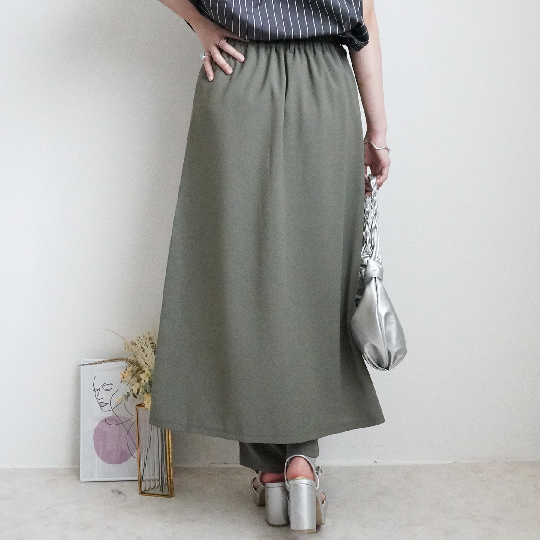 トレンド感と大人の品を両立した、スカートレイヤードデザインのパンツ