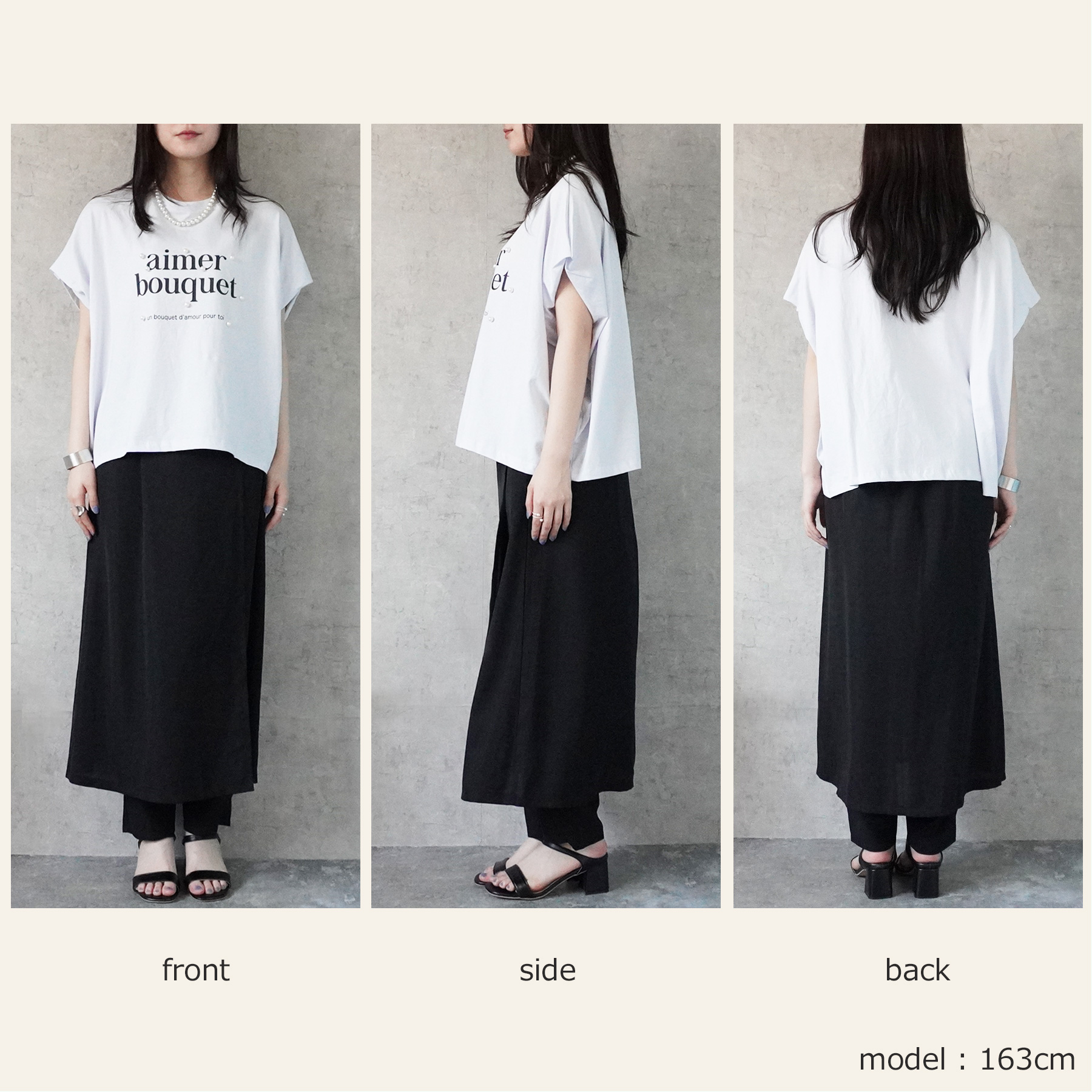 落ち感のあるシルエットで広がりすぎず、上品な印象を与えてくれます。